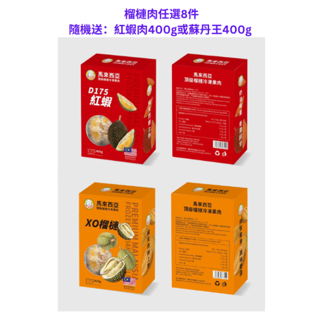 榴槤肉任選8件:隨機送: 紅蝦肉400g/蘇丹王400g